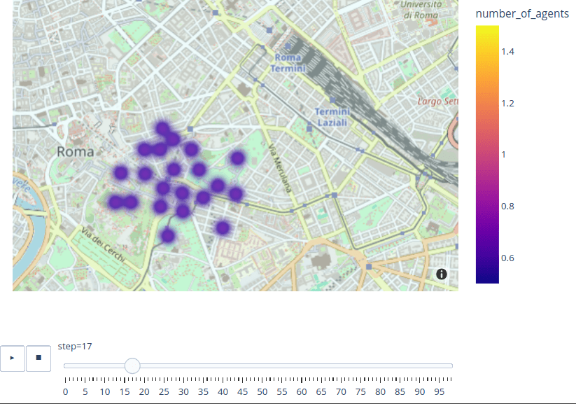 I also worked on a web-based visualizer for the simulation data in plotly (which for testing purposes was centered on Rome, my hometown), shown below: